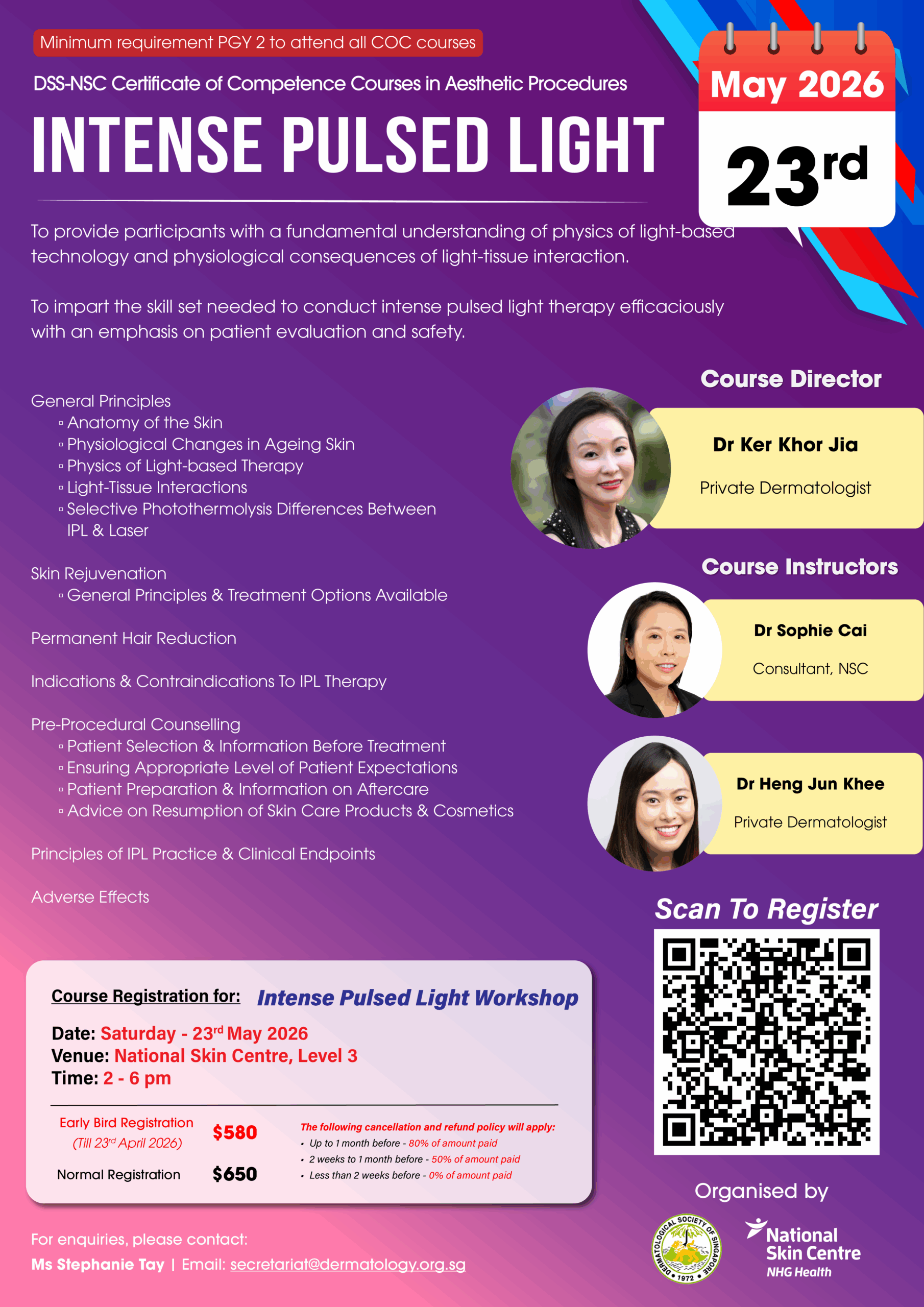 The Registration for the COC Course in Intense Pulsed Light is now open. Please refer to the details below (mobile users – landscape mode advised).